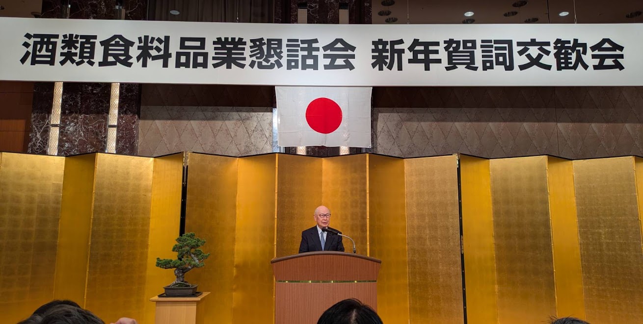 トップページ > トピックス, 酒・飲料, 流通 > 「酒類食料品業懇話会賀詞交歓会」開催 2026/01/09 2026/01/10 執筆者:編集部 酒類食料品業懇話会賀詞交歓会が1月5日、東京ロイヤルパークホテルで開催された。同交歓会には酒類、食品関連企業から839名が参加した。國分勘兵衛会長は「新年あけましておめでとうございます」と挨拶後、商品情報連携宣言に基づき、消費者とのパイプを太くしていくことが涵養と述べ、酒類食品業界の発展に寄与したいと抱負を述べた。この後、恒例の年男の発表が行われた。会場では伊藤忠食品など大手食品卸、キリンビールなどのメーカートップが顔を合わせ、新年の喜びを交歓していた。
