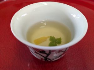 九品の料理が配膳され、そのうち汁物はお椀と温物でした。